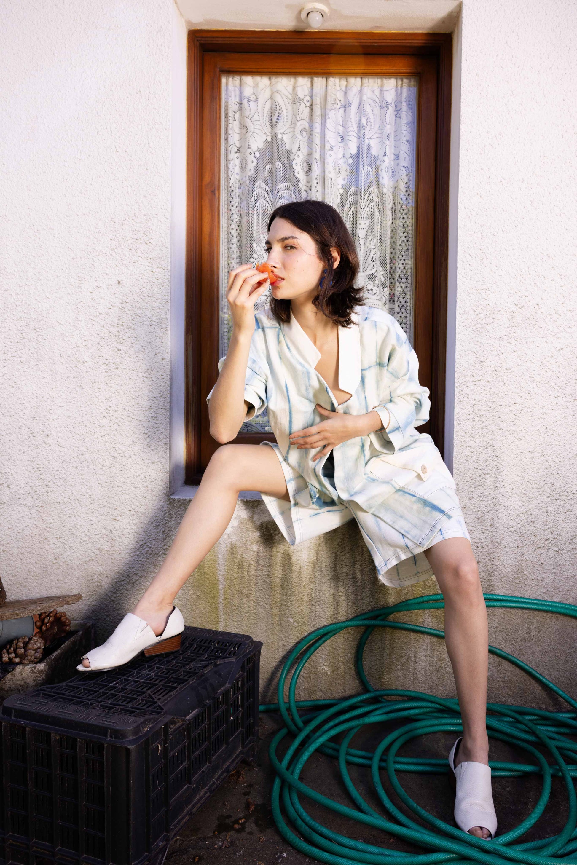 Bermuda de algodón y lino intervenida con rayas teñidas a mano en índigo, logrando un efecto vertical suave y orgánico.