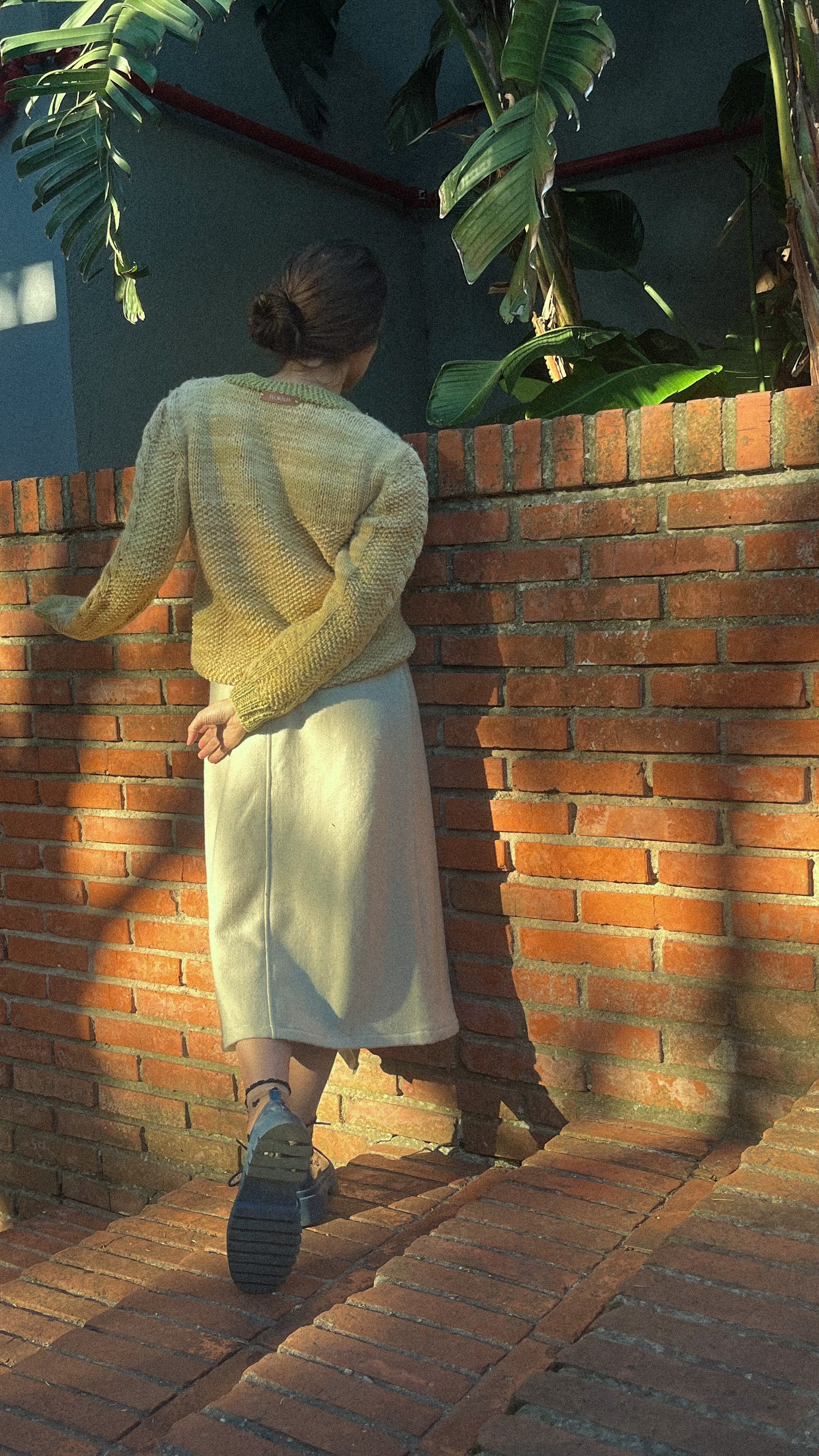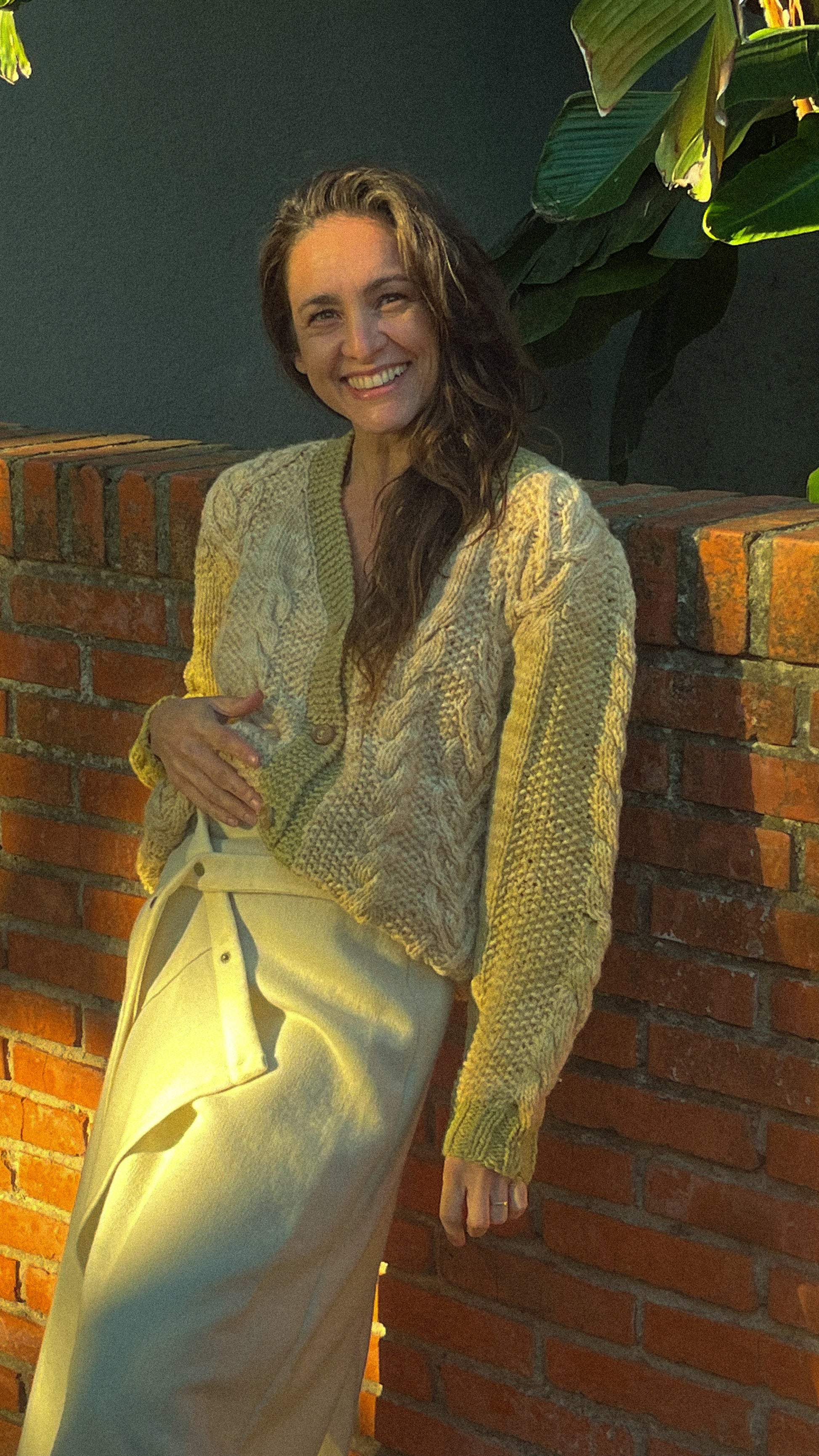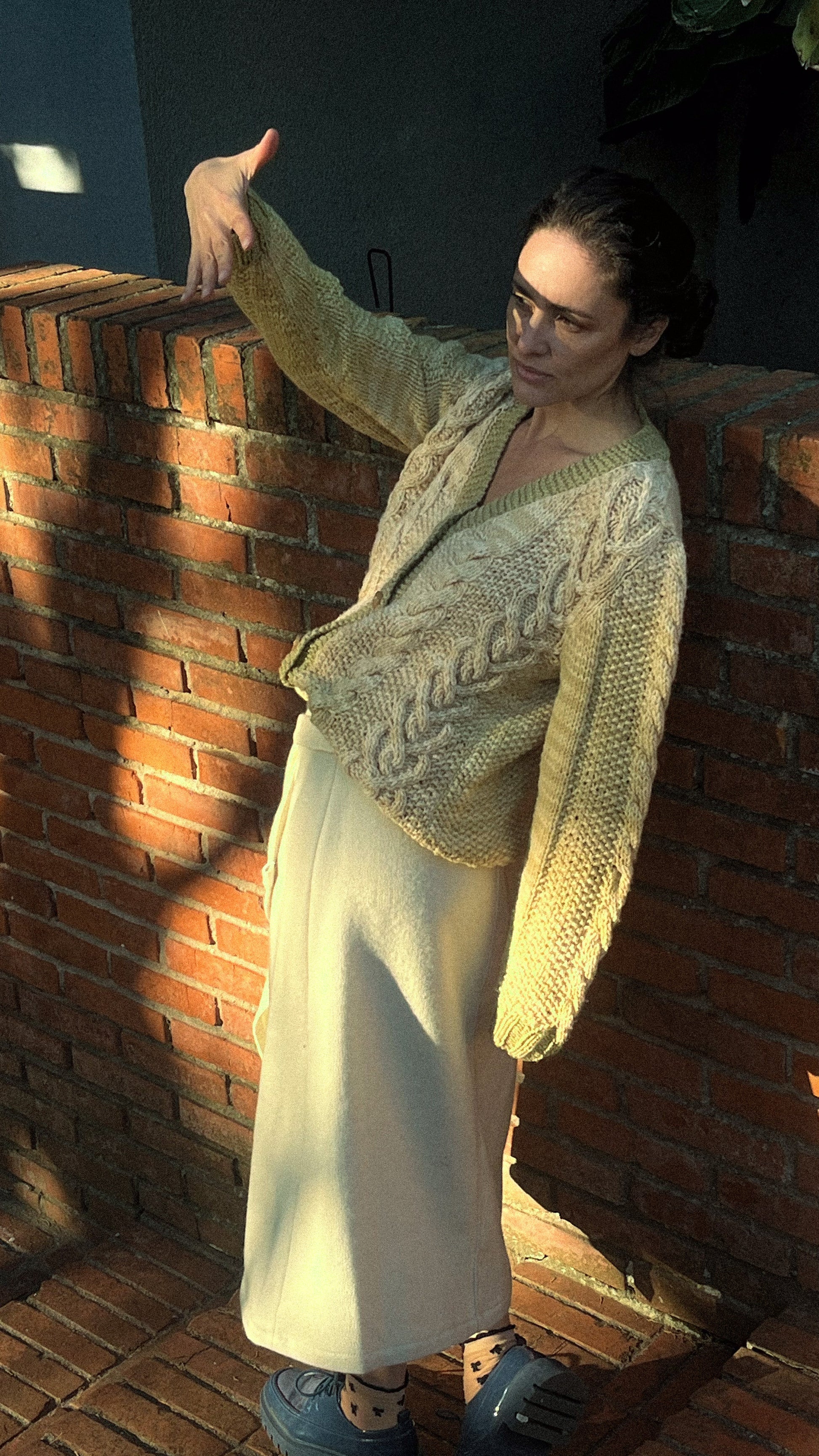 Cárdigan tejido a mano con trenzas y distintas texturas que enriquecen visual y táctilmente la prenda. Cada detalle celebra el oficio textil, desde sus puntos hasta los botones hechos en madera de olivo.