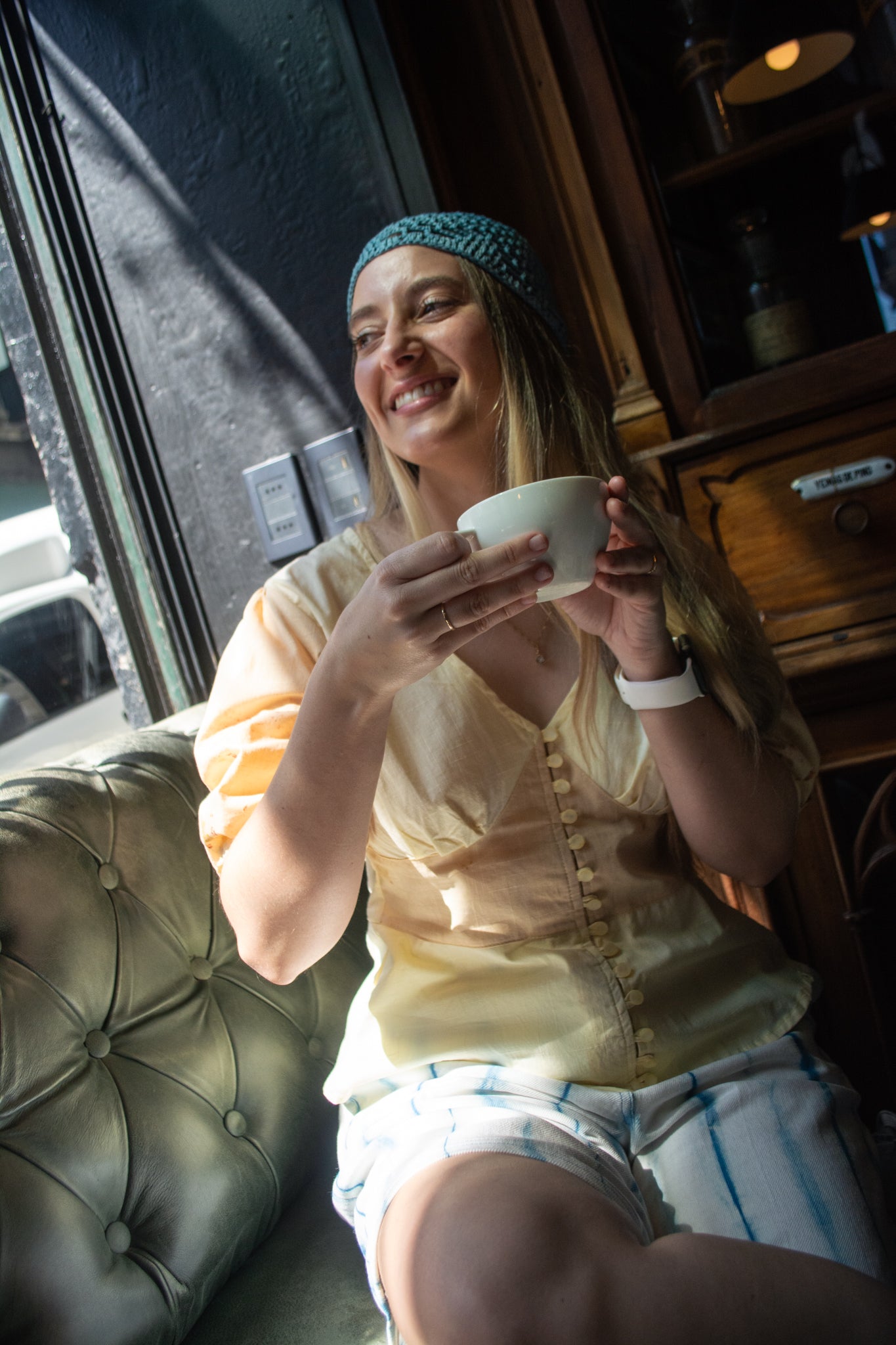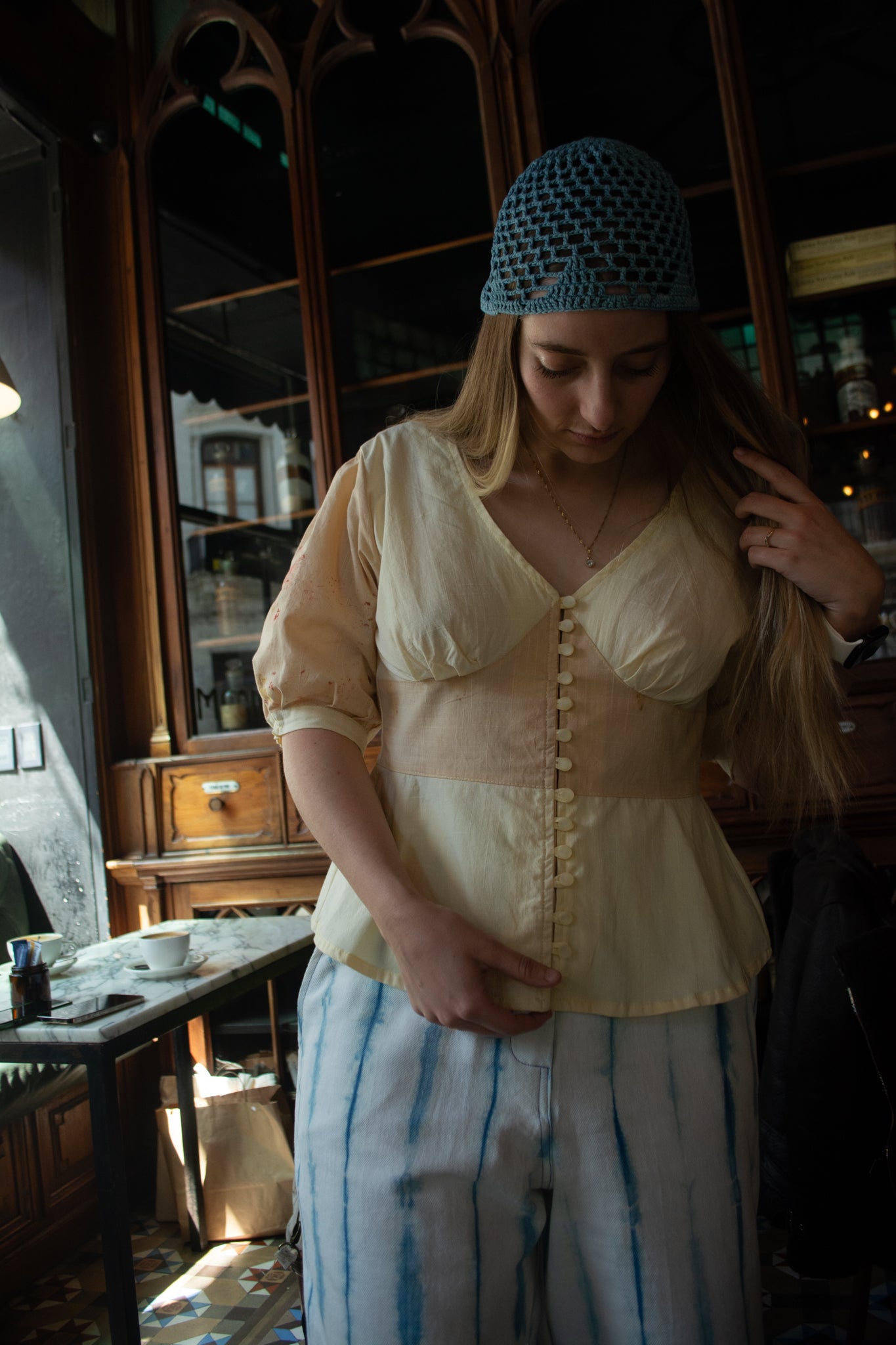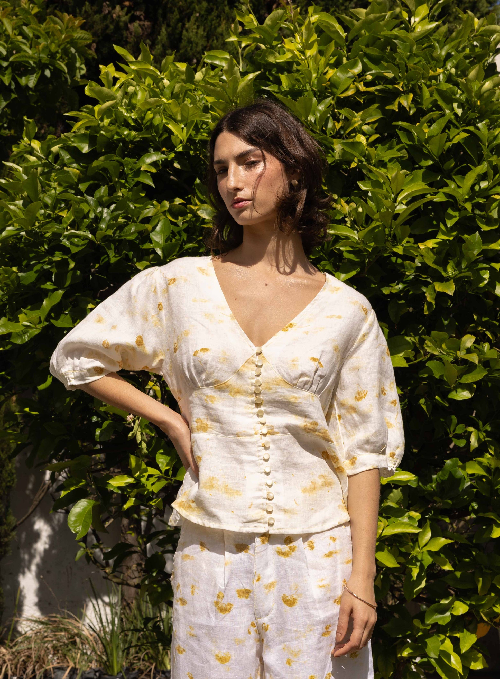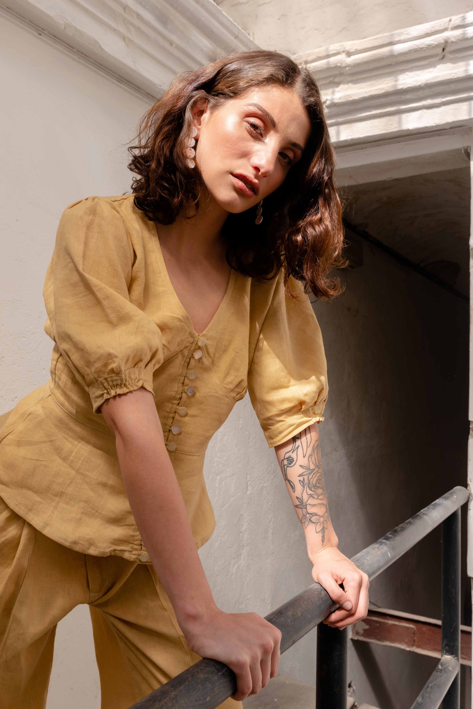Camisa con corte en la cintura y abotonadura central. Tiene manga abullonada con detalle de elástico en puños. Acompañada de botones que le dan un aire elegante enfatizando tu silueta.