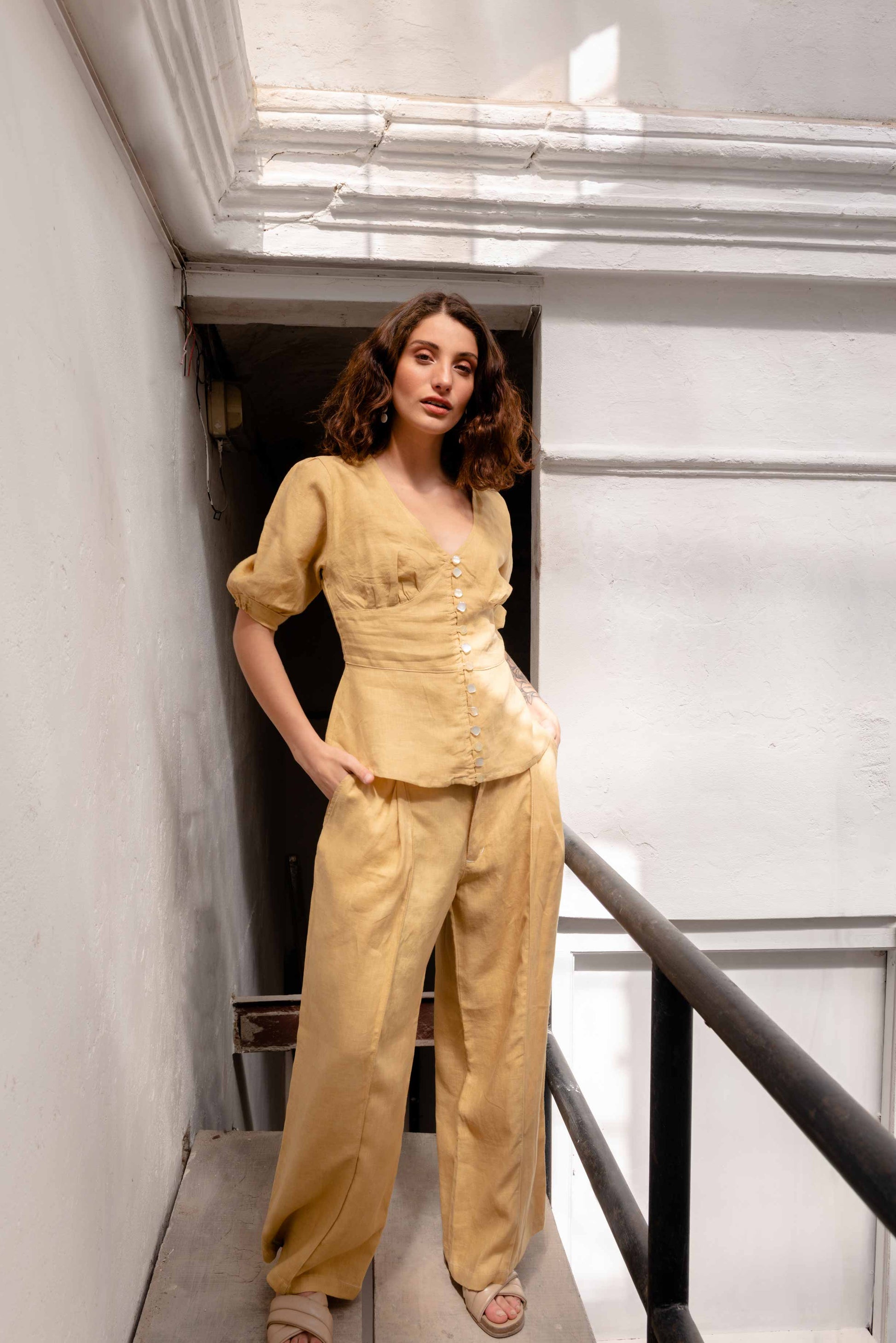 Pantalón tiro alto en 100% lino con un fit holgado pero de estilo elegante con bolsillos a los costados y pinzas tradicionales.