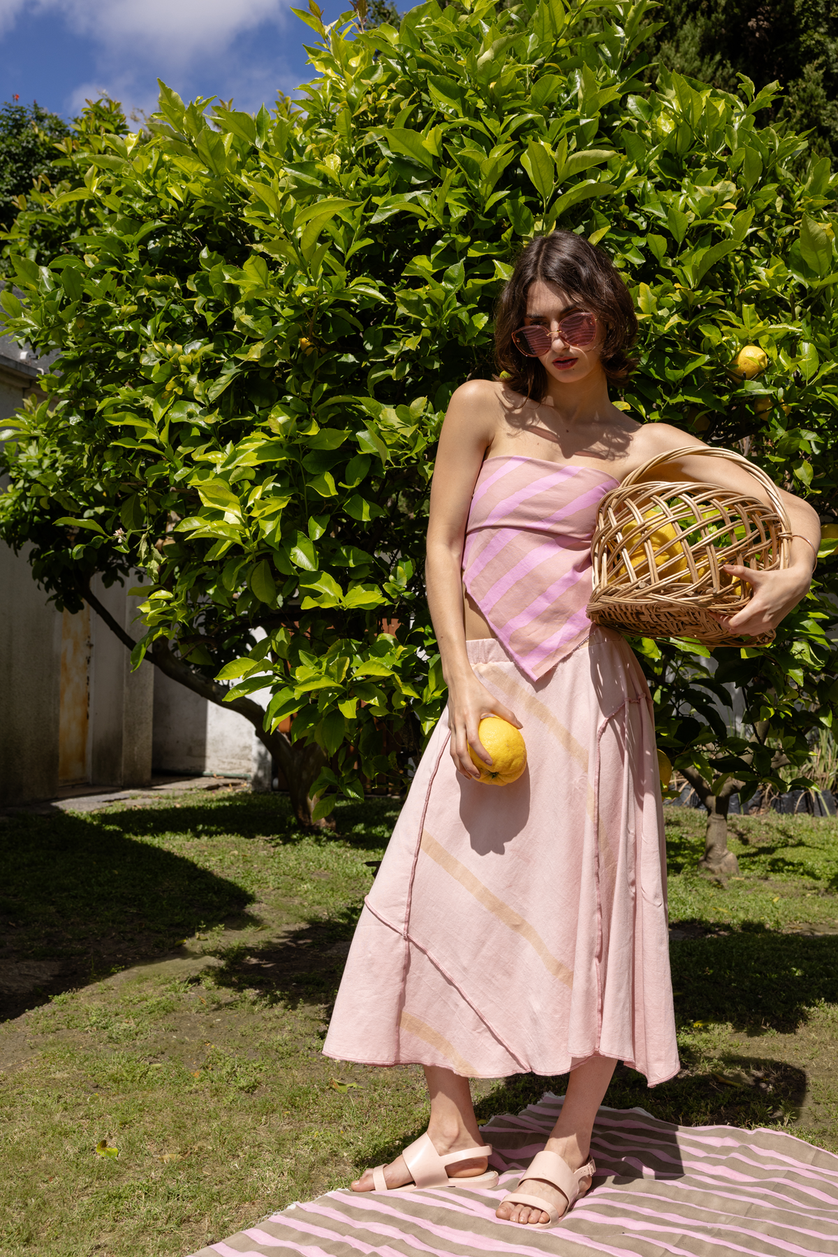 Falda midi evasé confeccionada en algodón con rayas diagonales teñidas a mano en tonos rosados y arena.