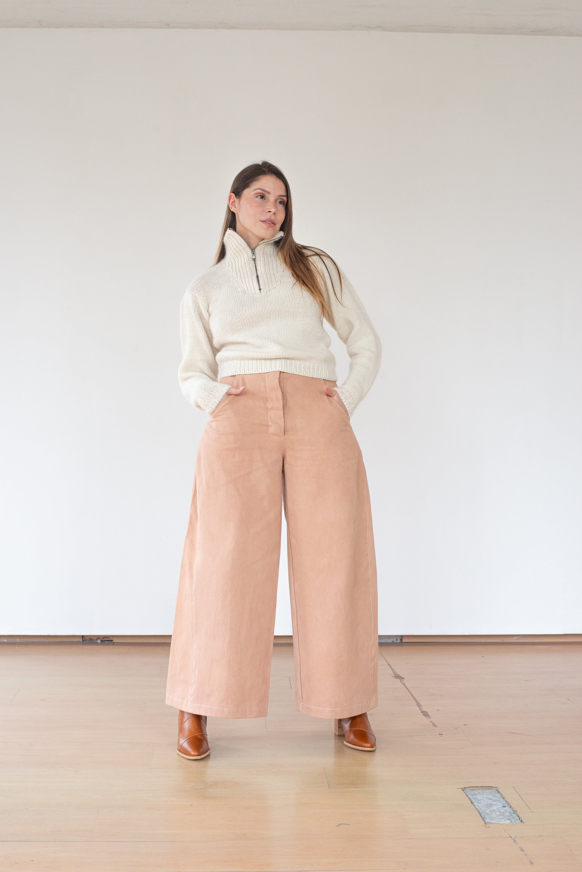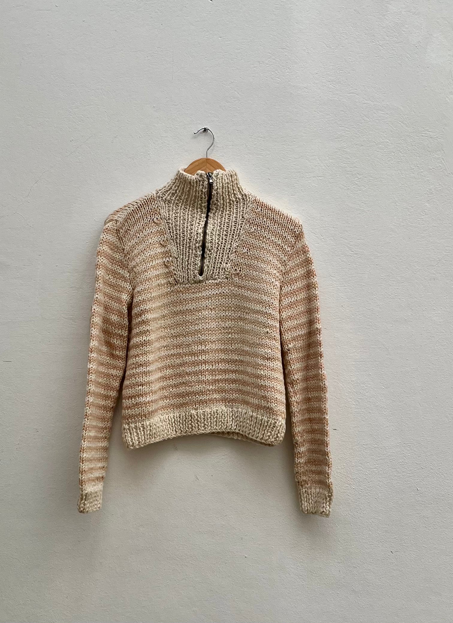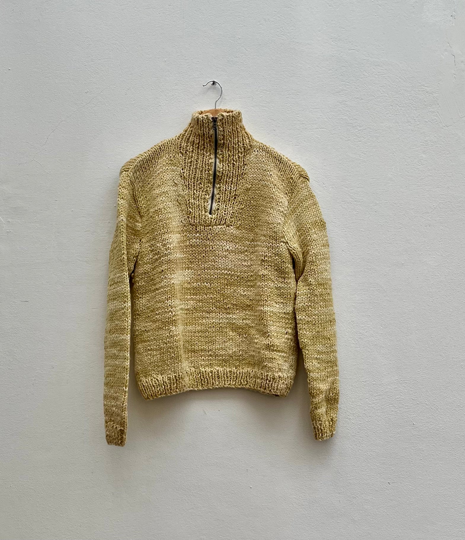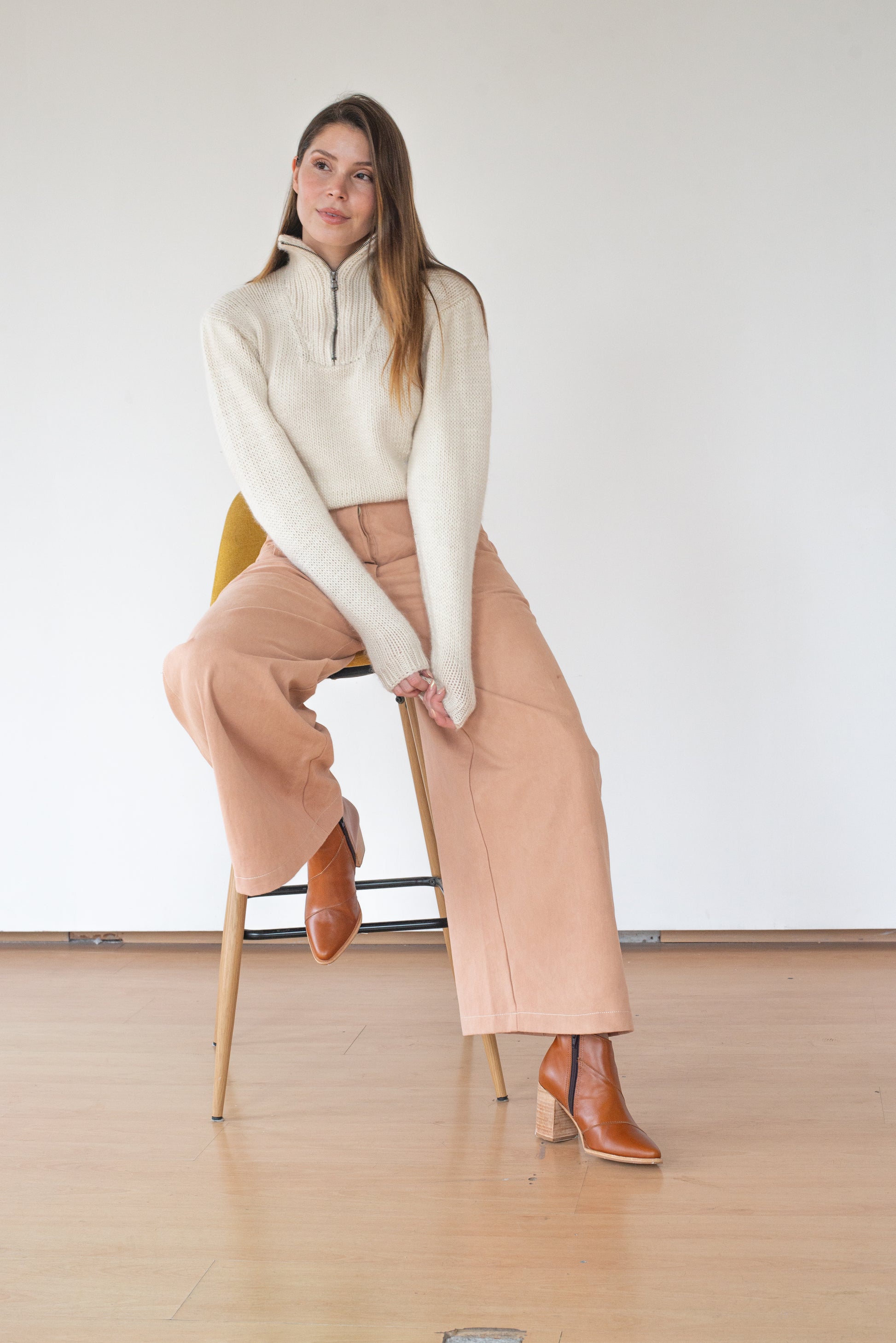 Suéter tejido a mano en 100% lana merino, con cuello alto y cierre metálico que permite jugar con su forma y uso. De textura envolvente y diseño funcional, es una prenda que combina abrigo y comodidad.