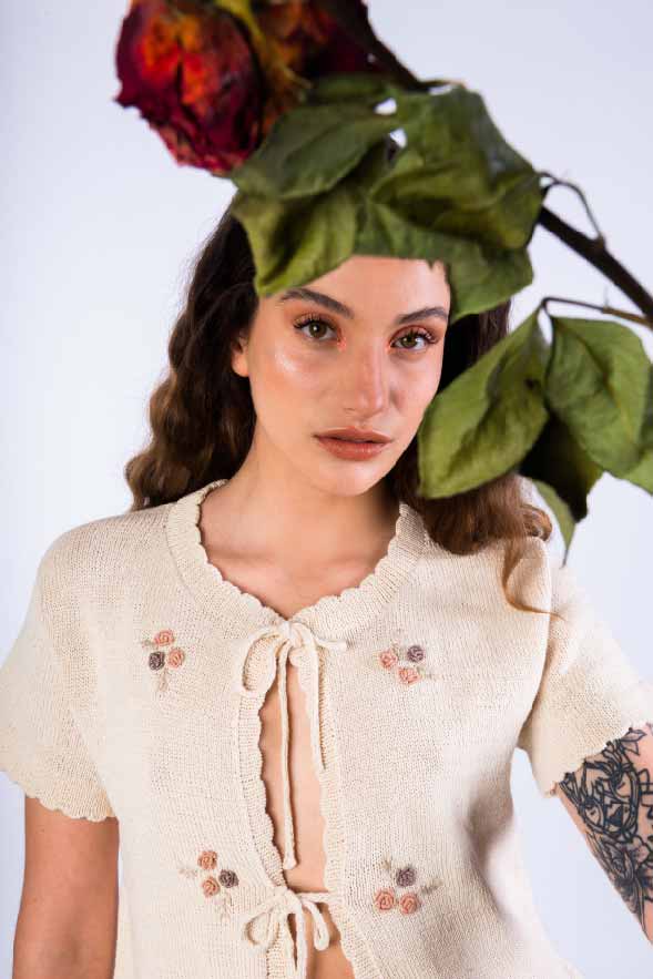 Saco tejido en 100% algodón color natural con bordados en hilo teñidos manualmente en delantera. Lo podes cerrar con los lazos incorporados.