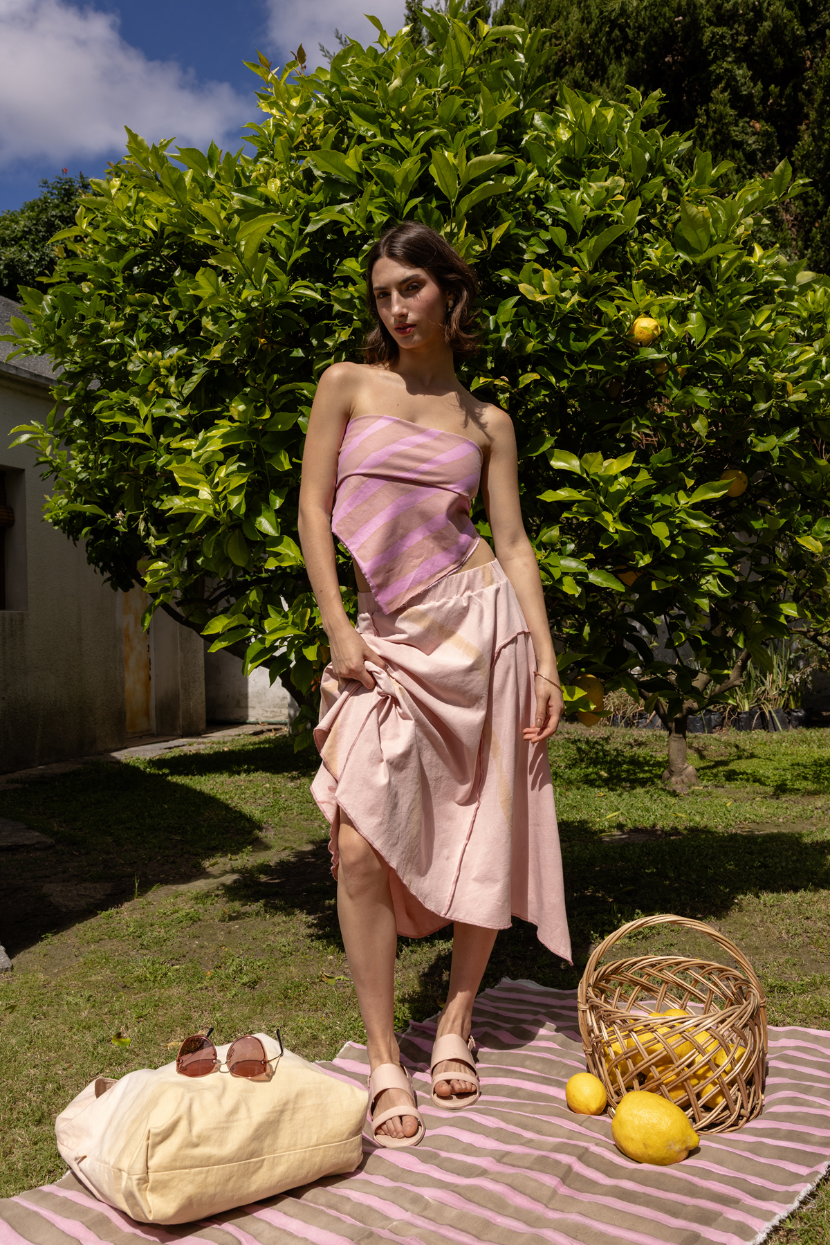 Pañuelo multifunción confeccionado en un algodón liviano con rayas teñidas a mano en tonos rosados y amarillo.